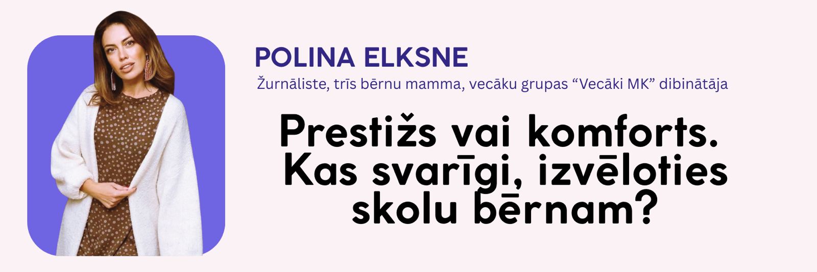 Polina Elksne aktualizēs jautājumu par skolas izvēli: kas patiesībā ir svarīgāk — prestižs vai komforts, reitingi vai vide, kurā bērns aug un attīstās?